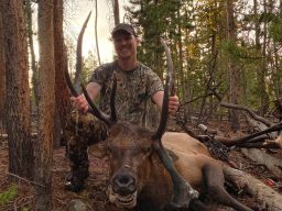 While descending the high alpine timber through intermittent rain showers, one of our locate bugles was finally answered by our target quarry in a secluded bowl several hundred yards east. It’s amazing how a hunt can go from doldrums to frenzy in an instant. Within seconds, three eager hunters were staged, bow-in-hand, straining our senses in the direction of the foreign noise ahead while the most experienced caller of our troupe dropped back to continue the vocal performance. Barely after setting up the big bull ripped a bugle and raked a tree in front of Mike who was at the center of our skirmish line. In even less time the bull’s nostrils filled with our repugnant odor and about faced while Mike temporarily earned the nickname “Travis Barker” for the abuse he inflicted drumming an innocent pine in the frenzy as the mature 5x5 ran away.