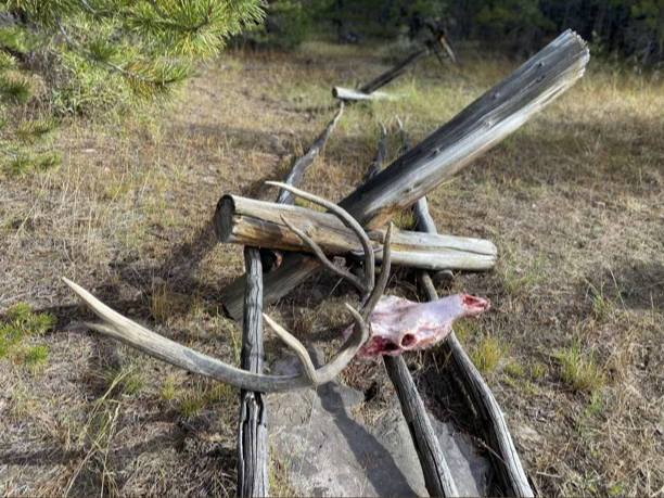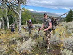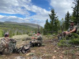 Daybreak came quickly and at the same time not fast enough for our weary yet eager group of travelers. Our plan was to hunt our way up a small, timbered, flat-bottomed drainage calling and looking for fresh sign. Excitement came quickly with two encounters with spike bulls before lunch. After gaining 1,300 feet of elevation our legs and lungs let us know that it was time to break for lunch. Refreshed by our brief respite we spent the afternoon hunting above 10,000 feet finding only dry scat and year-old rubs. It was clear that the fresh sign was down lower and so after waiting out a brief storm that rolled through we pointed our gate back down gradient.